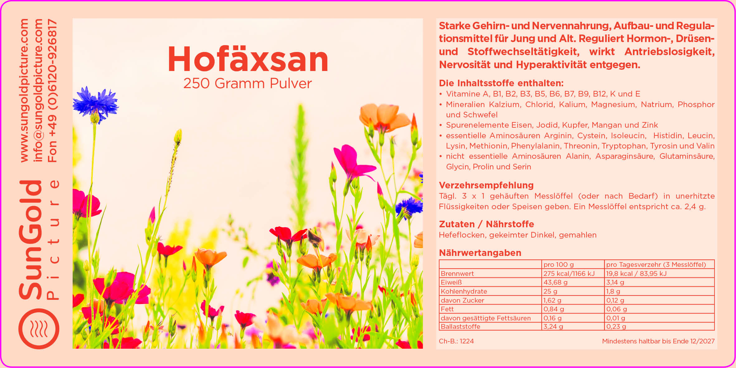 Hofäxsan ist das ideale Aufbaumittel. Es unterstützt sehr bei Erschöpfungszuständen, Konzentrationsproblemen, körperlicher und seelischer Schwäche und Depression. Es ist die ideale Nahrung, vor allem bei allen Vitamin B- und E- Mangelerscheinungen.