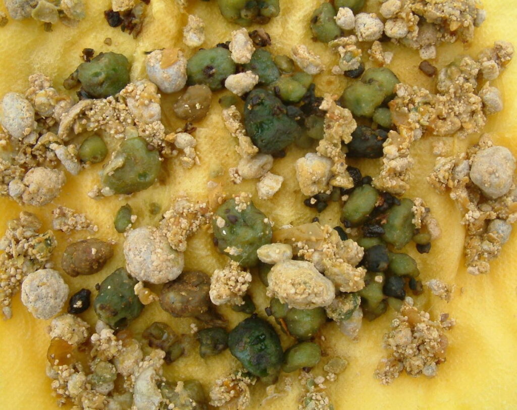 Die größten der hier abgebildeten Gallensteine: 2,7 cm, die Gesamtmenge (1 handvoll) wurde innerhalb eines Tages ausgeschieden.